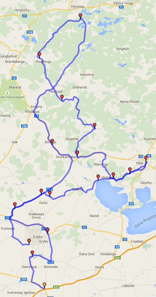 Gårdstånga - Ellinge - Eslöv - Trollenäs - Stockamöllan - Billinge - Röstånga - Mot Perstorp - Riseberga - Forestad - Hallaröd - Pugerup - Väg 13 mot Höör - Mot Hänninge - Ormanäs - Höör och Hardys - Tillbaka samma väg förbi ormanäs - Stehag - Öslöv - Trollenäs och till Eslöv.