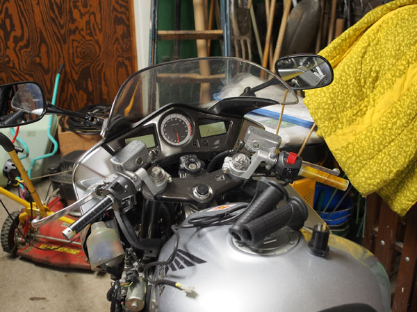 Jag har varit otydlig. Det jag menade var längt/höjd på clip-onen, styret känns fel att skriva när det inte är ett styre. Jag har bytt handtag, som syns så gick det bra att få av dem. Det är lite lurigt med att få vänster handtag att sitta däremot, använde tydligen för lite lim för det lossnade när jag försökte vålda upp hojen på centralstödet.