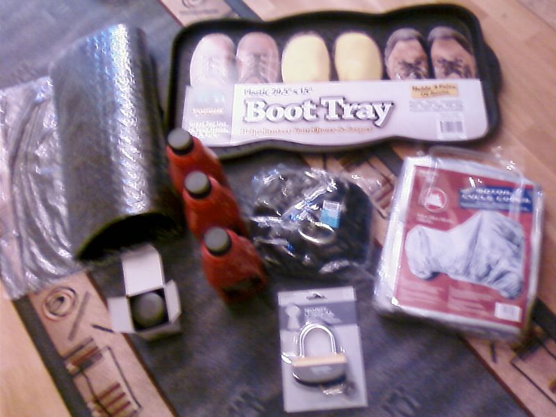 I det närmaste redo för vintern! Från vänster: en stor gummimatta att ha under Edwin på jobbet, ett stövelunderlägg att ha hemma, oljefilter och olja att byta på svartviffern innan den får gå i ide, kätting och lås för båda viffrarna att sätta fast i närmaste lämpliga plats på altanen (viffrarna kommer att stå tätt tätt under vintern om kättingen ska räcka) samt ett helkapell för svartviffern.