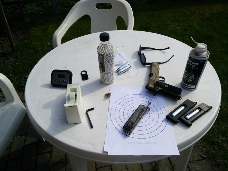 Pistolen på bordet är en ASG-kopia på en STI Tac Master. Kraftig rekyl på den är det, och anslagskraften är stor nog att göra bra med bucklor i mm-tjock alu från ca åtta meters håll. Ett impulsköp blev det också hos den lokale vapenhandlaren, ytterligare en ASG-kopia; denna på en Glock 17. Fjäderdrivet funkar bra inomhus.