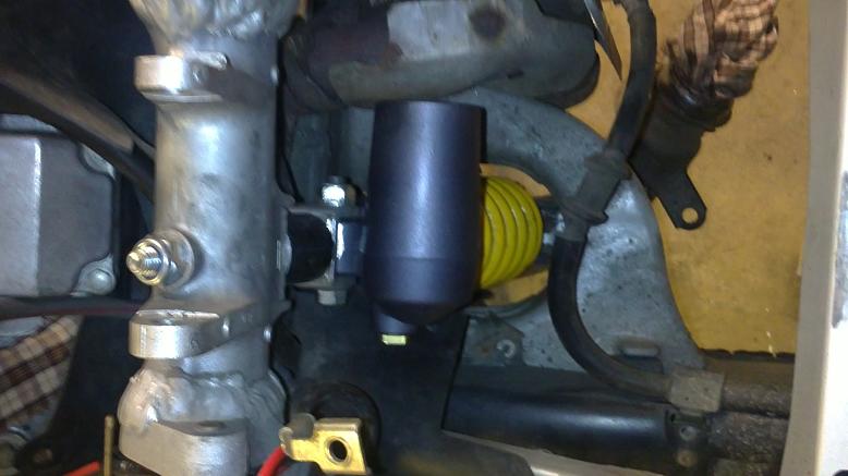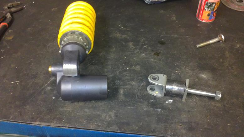 Där efter plockade jag ihop adaptern för lite provmontering. Upptäckte då att denna däpmpare är bra mycket tjockare i färstet än orginal. Förutom att slipa ner halva bultskallen fick jag slipa bort lite på dämparen.