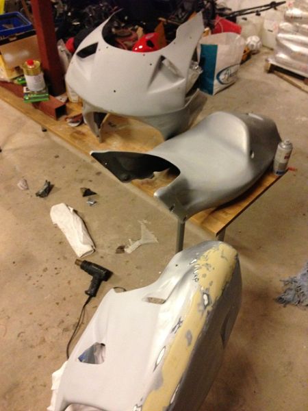 Sedan slipa ner kåpor och spackla upp sprickor plus att underdelen var tvungen att laga ett 10*5 cm hål som avgasröret bränt hål samt hål efter race, service, transporter och förvaring. Startade motorn körde den varm och sedan tillsatt 2 matskedar 2t olja till bensinen för att smörja insprutare mm tömt den på bensin och skall tömma den på olja.