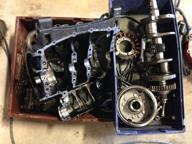 Det roliga i det hela var att jag såg en annons på blocket om en bike som Peter Sköld var pappa till, svårt att tro men köpte den på chans och till min stora glädje var det HRC kittat stakar kolvar och kammar, portad topp och 4-1 och öhlins bak, fram var en riktig sunk gaffel, skall försöka hitta något vettigare och peta dit, Elsystemet var helt sönder moddad, bara att klippa bort, och lika så kåpor på tippen osv. nu har jag klätt av den och rivit motorn i molekyler och beställt ny lager