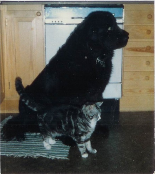 Katten innan dess var på 80-talet. Felix tyvärr inte så gammal, bara 2 år, då nån grannjävel förgiftade honom när jag själv bodde i USA ett år. På bilden tillsammans med vår Newfoundland, som även hon liksom de katterna blev 16 år.