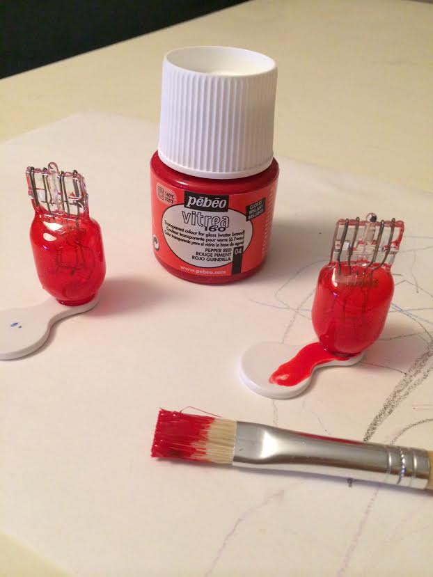Med facit i hand borde jag ha testat hur färgen blev INNAN jag brände fast färgen genom att lägga lamporna i ugnen 40min i 160grader. Då hade det kanske gått att skrapa bort färgen.